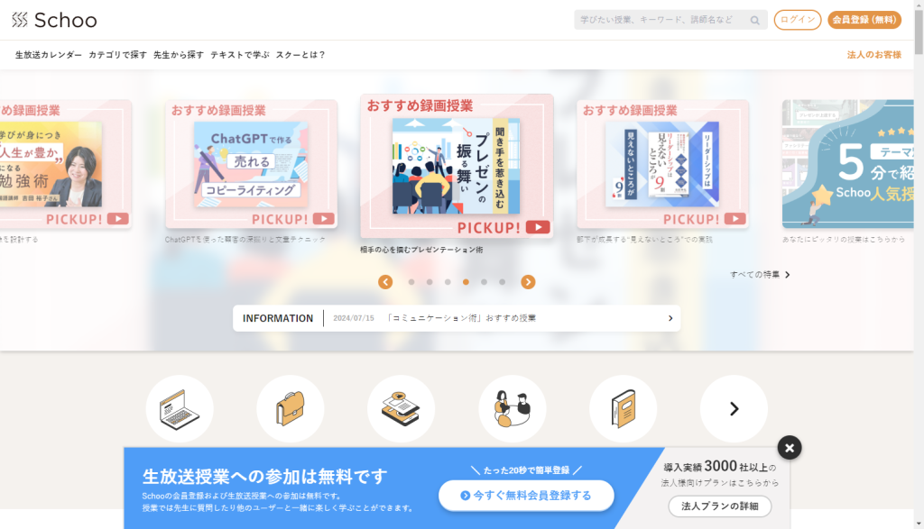 は、ビジネススキルやプログラミング、デザイン、マーケティングなど、様々な分野のオンライン学習サービスを提供しているプラットフォームです。以下に、Schoo
